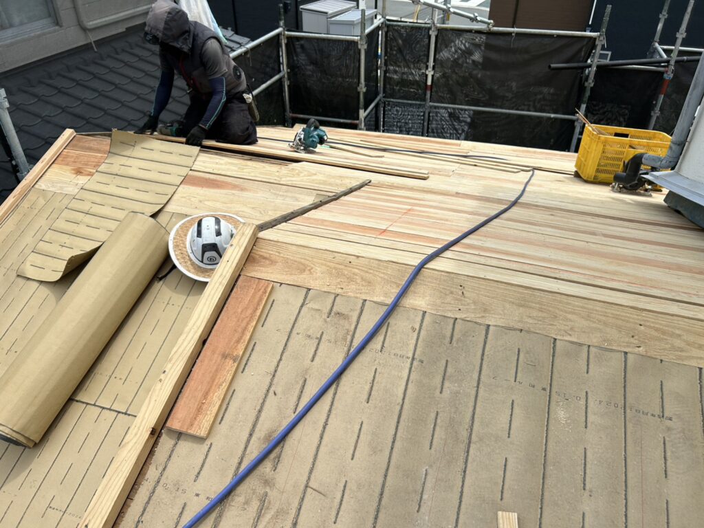 下地から新しい屋根に交換する工事です。