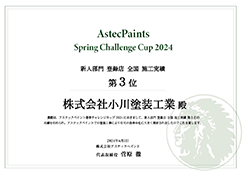 アステックペイント春季チャレンジカップ2024 新人部門 全国 施工実績第3位